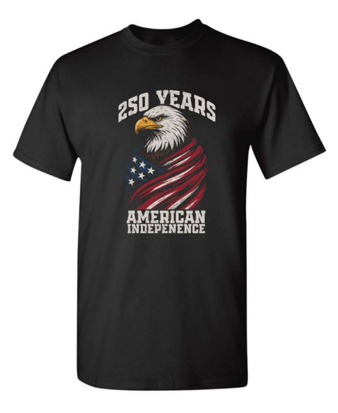 Celebrate 250 years of American independence with this bold patriotic design. Featuring a striking bald eagle wrapped in the American flag and the statement “250 Years – American Independence”, this front-print graphic captures heritage, pride, and strength in a timeless layout. The distressed detailing gives it a classic, vintage-inspired feel while the black tee makes the red, white, and blue artwork stand out.