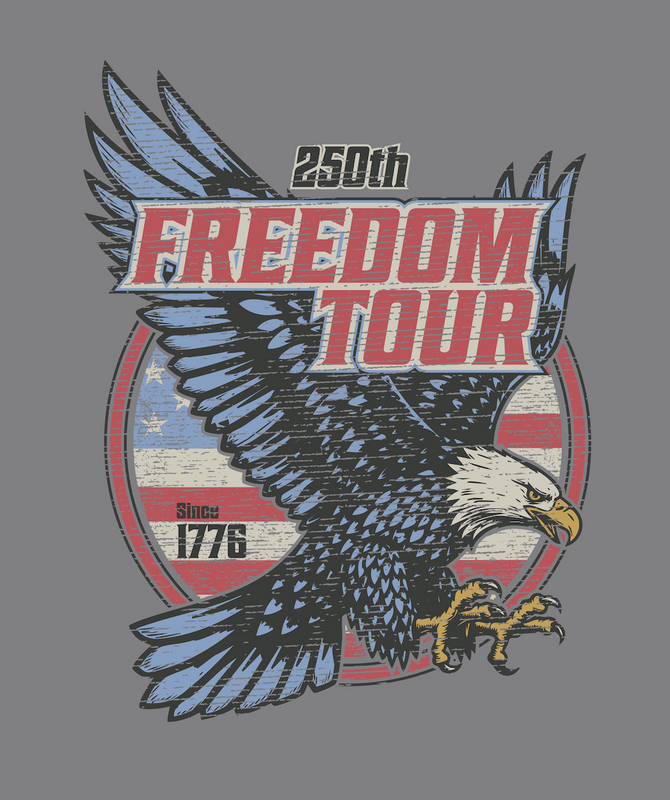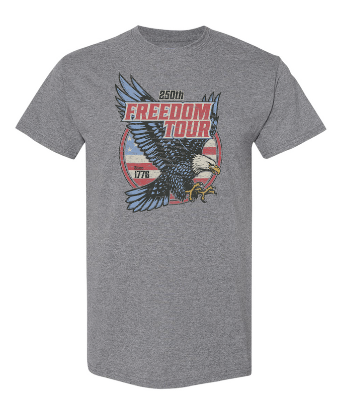 Celebrate 250 years of American independence with the 250th Freedom Tour Eagle Tee. Featuring a bold front graphic of a soaring bald eagle layered over a vintage American flag backdrop and “Since 1776” detail, this design captures patriotic energy with a classic, distressed tour-style aesthetic. Printed on a Nickel Heather tee, it delivers standout color contrast and everyday wearability.