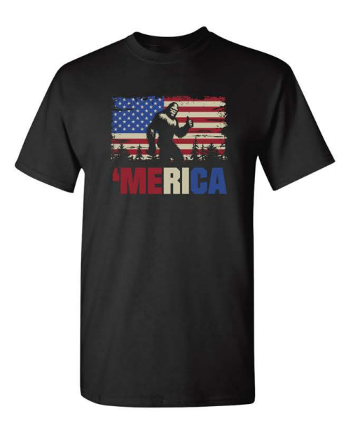 Show off your American pride with a little legendary flair. The “‘Merica” Sasquatch patriotic tee features a bold front graphic of Bigfoot giving a thumbs-up in front of a distressed American flag backdrop. Finished with red, white, and blue “‘MERICA” lettering, this design delivers classic summer patriotism with a fun, outdoors-inspired twist.